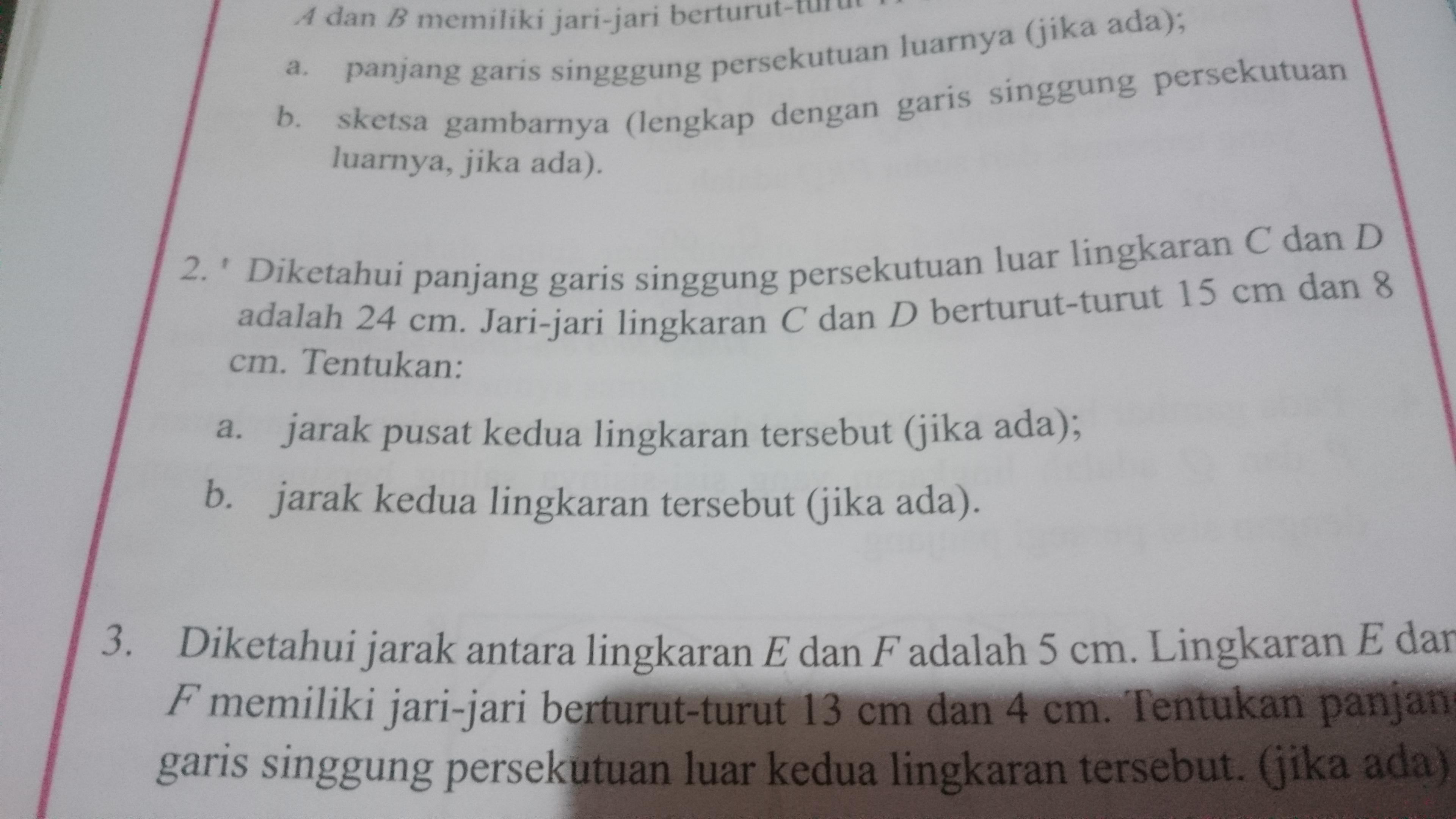 (jika ada) soal no 4 diketahui selisih diameter lingkaran g dan h adalah 10 cm. diketahui jarak antara lingkaran e dan f adalah 5 cm. jarak pusat kedua lingkaran tersebut (jika ada); 3 1 diketahui jarak antara lingkaran e dan f f dalah 5cm. Int (jika ada) a) 4 1 diketahui selisih diameter lingkaran g dan h adalah 10cm panjang garis singgung persekutuan dalamnya adalah 20cm sedangkan jarak kedua pusat lingkaran tersebut adalah 25cm.